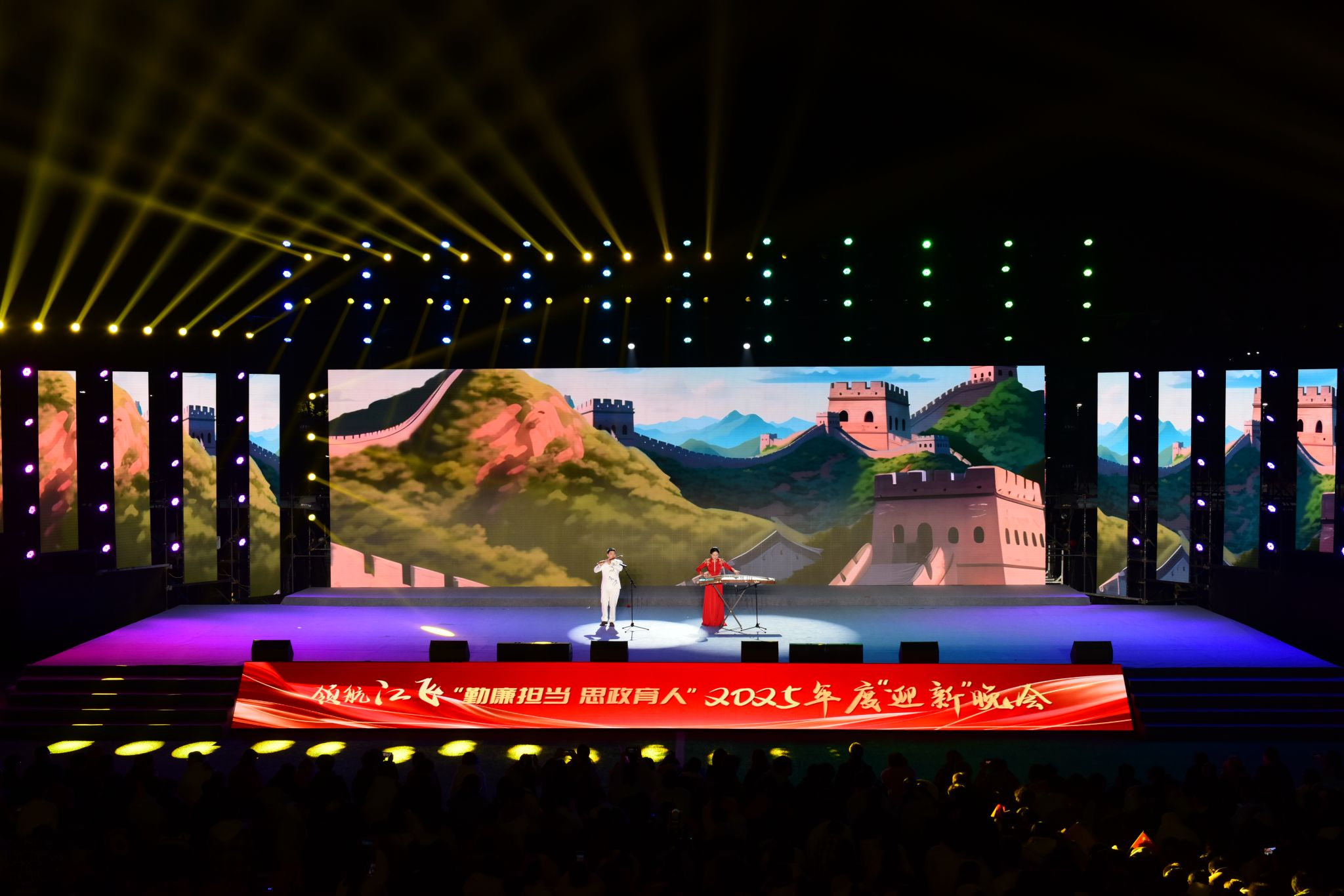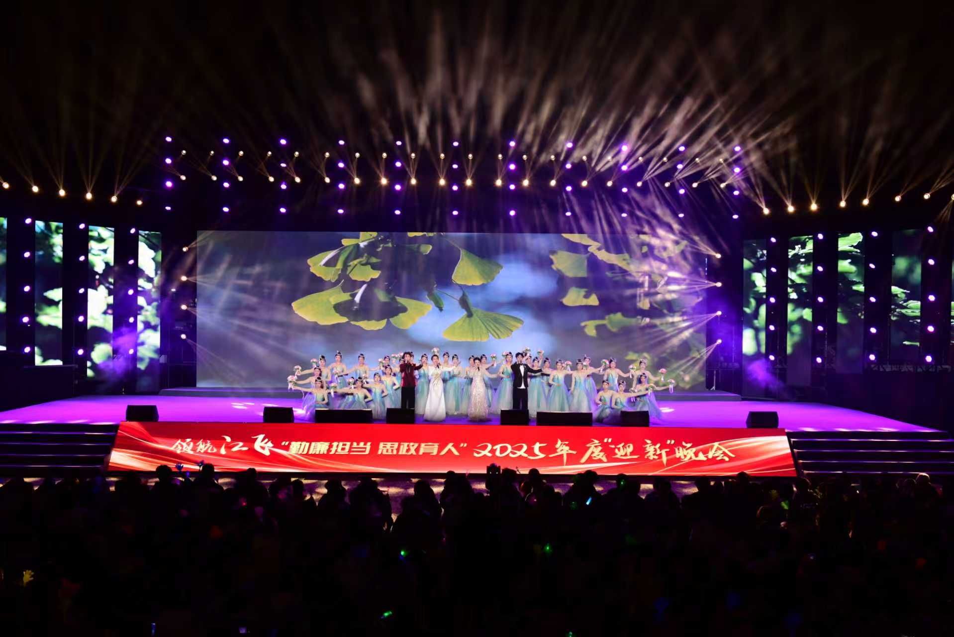 无人机表演率先点燃全场热情。晚会在激昂的《强军战歌》大合唱中正式开幕。诗朗诵《江飞正青春》抒发了对学校的深厚情感与美好祝愿,歌舞《人民的名义》诠释了立德树人的初心使命。《立足三尺讲台 践行教育家精神》以铮铮誓言表达了对教育事业的坚守。快板《廉政花开结硕果》以通俗活泼的形式传递勤廉理念,原创歌曲《爱如莫言》用旋律诉说着师恩情深。情景剧《站在历史的画廊回望你——况钟》贯通古今,激发奋进力量,舞蹈《桃李芬芳》《幸福江飞飞起来》则以优美舞姿展现艺术魅力。