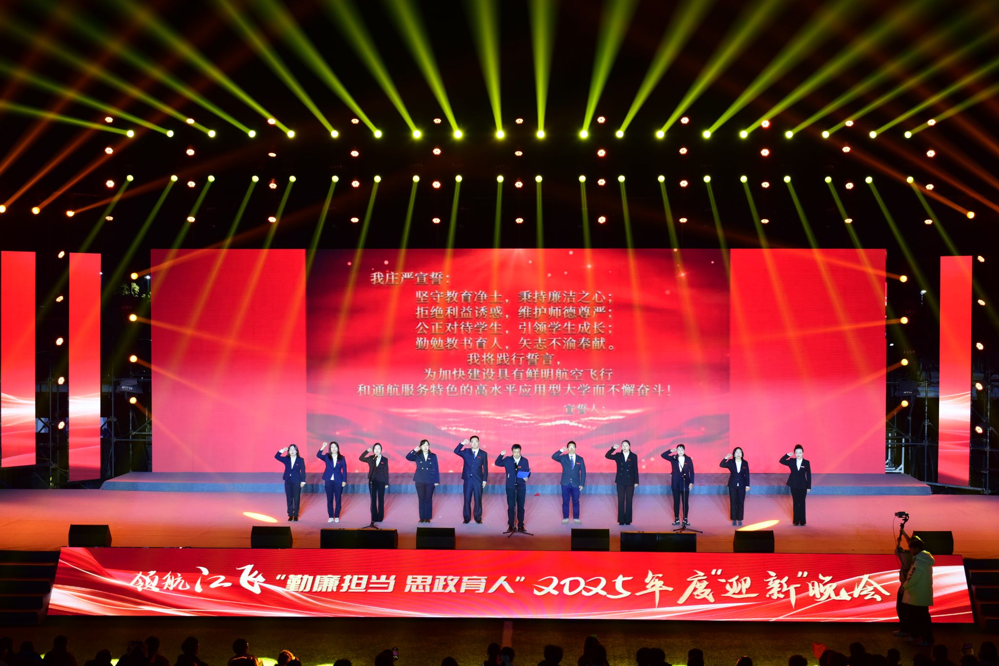 晚会期间,校领导与各二级学院党总支书记分别为“国家奖学金”“国家励志奖学金”获奖学生代表颁奖,表彰先进,树立青春榜样。随后,风尚秀《大美江飞》以创意编排展现校园风采,乐器演奏《国韵雅乐》勾勒出国风雅韵,青春舞《红日》涌动蓬勃朝气,话剧《红飞之路》生动展现了航空报国情怀。最终,晚会在气势磅礴的大型歌舞《领航》中圆满落幕。