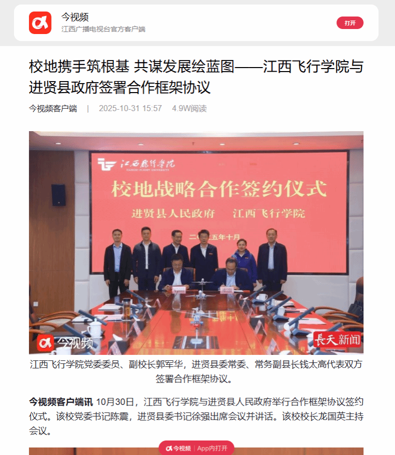 近日,今视频报道,校地携手筑根基 共谋发展绘蓝图——江西飞行学院与进贤县政府签署合作框架协议详情如下