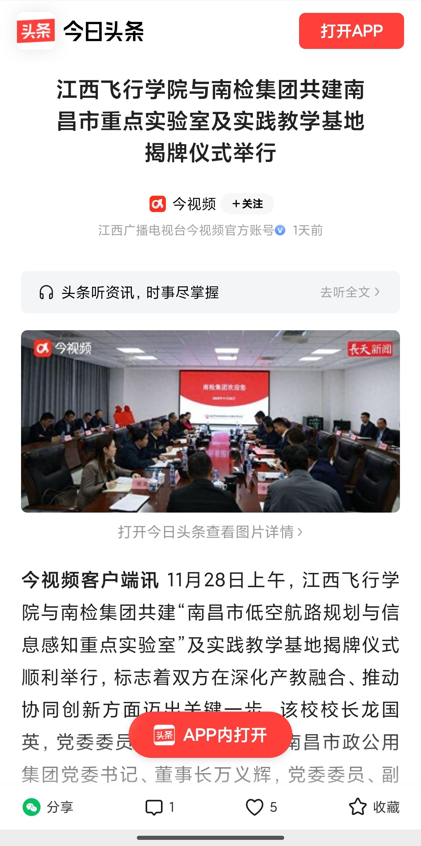 今日头条:江西飞行学院与南检集团共建南昌市重点实验室及实践教学基地揭牌仪式举行