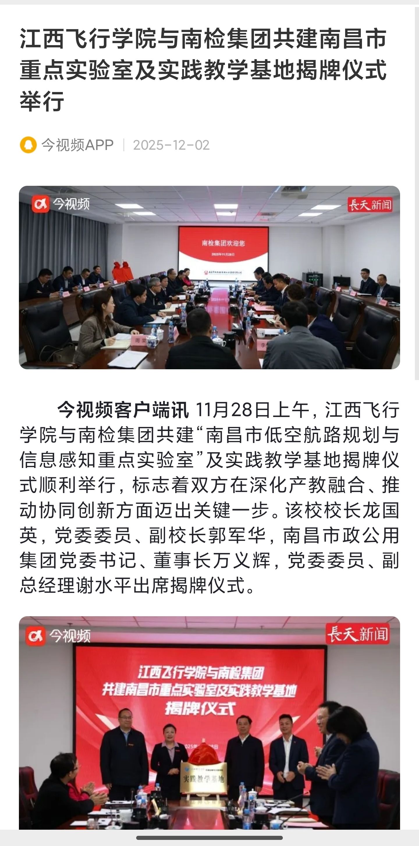近日,腾讯网报道,江西飞行学院与南检集团共建南昌市重点实验室及实践教学基地揭牌仪式举行详情如下
