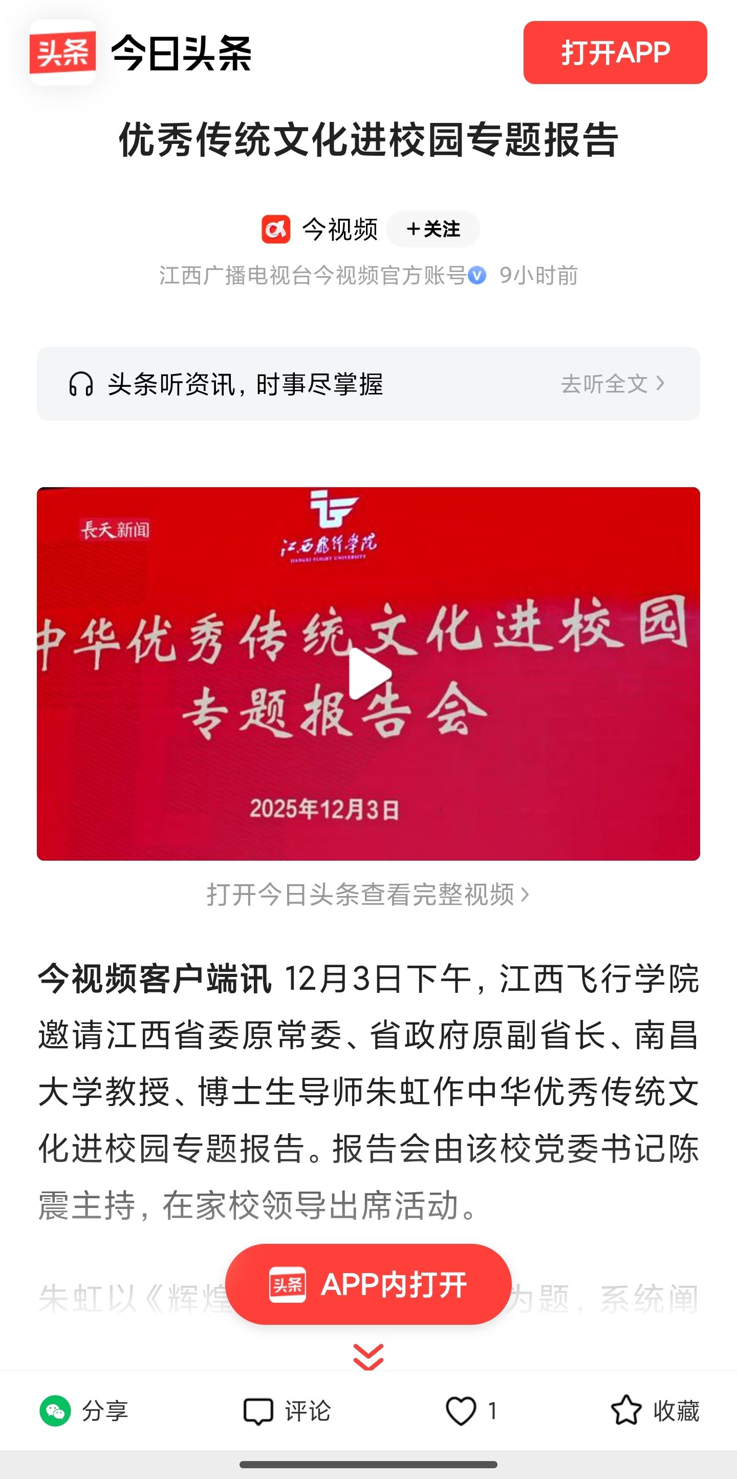 近日,今日头条报道,朱虹应邀来江西飞行学院作中华优秀传统文化进校园专题报告详情如下