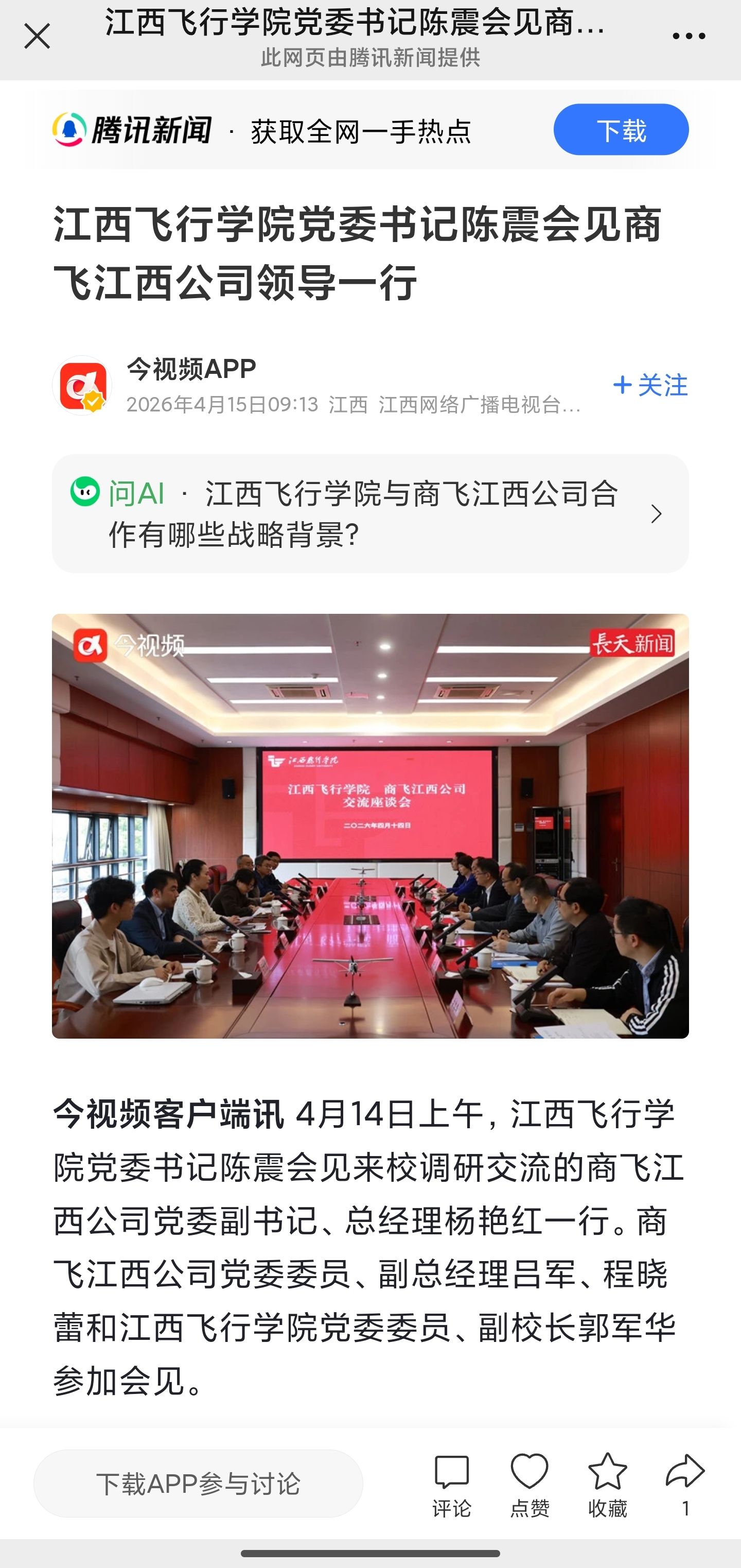 腾讯新闻:江西飞行学院党委书记陈震会见商飞江西公司领导一行